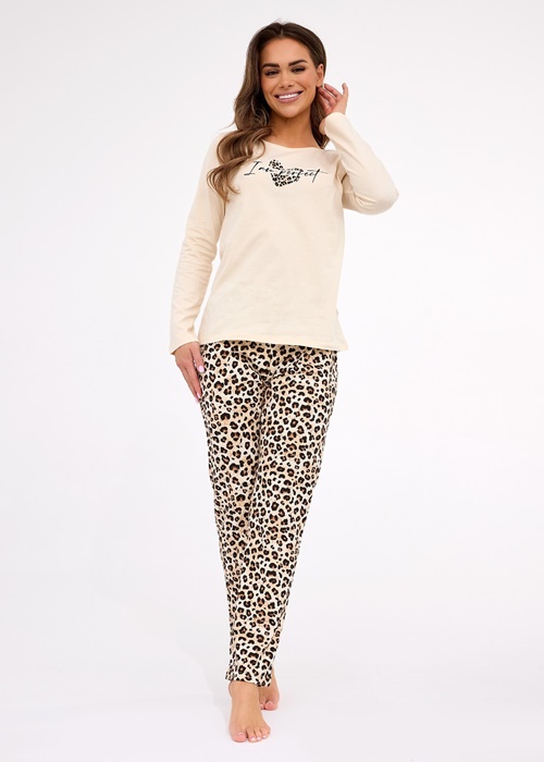 Piżama długa Cornette 655/439 I Am Perfect w kolorze kremowo beżowym ze spodniami w panterkę.