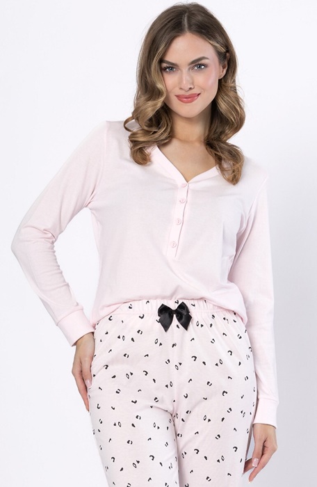 Piżama damska rozpinana u góry z długimi rękawami i długimi spodniami. Dekolt bluzki w szpic. Piżama uszyta jest ze 100% bawełny. Góra bluzki zapinana na 4 guziki. Piękna piżama z górą bluzki zapinaną na guziki – idealny wybór jako piżama do szpitala, na operację, do porodu, czy też jako piżam dla młodej mamy do karmienia. Elegancka piżama damska rozpinana u góry z efektownymi lamówkami.