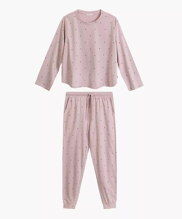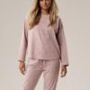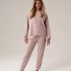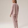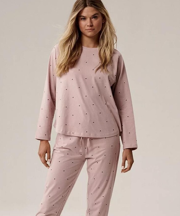 Piżama damska z długimi spodniami i długim rękawem. Po bokach spodni kieszenie. Bluzka od piżamy ma okrągły dekolt. Spodnie piżamy długie i wykończone ściągaczami. Piżama damska uszyta jest z naturalnej, miękkiej 100% bawełny.