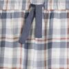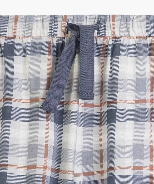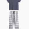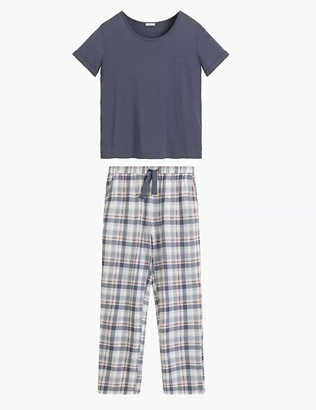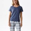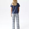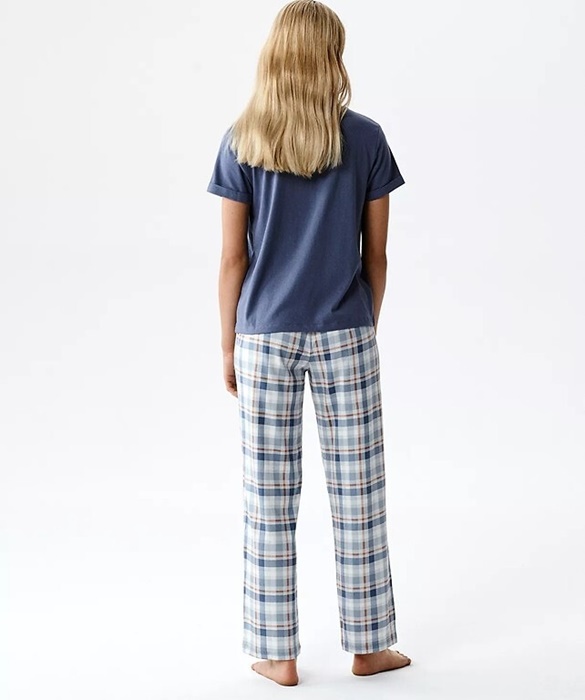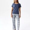 Piżama damska z długimi spodniami i krótkimi rękawami. Po bokach spodni kieszenie. Bluzka od piżamy ma okrągły dekolt. Spodnie piżamy długie w kratę. Piżama damska uszyta jest z naturalnej, miękkiej bawełny z dodatkiem modalu.