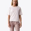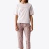 Piżama damska ze spodniami 3/4 długości i krótkimi rękawami. Po bokach spodni kieszenie. Bluzka od piżamy ma okrągły dekolt. Spodnie piżamy rybaczki w ciekawy wzorek. Piżama damska uszyta jest z naturalnej, miękkiej bawełny.