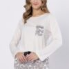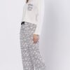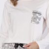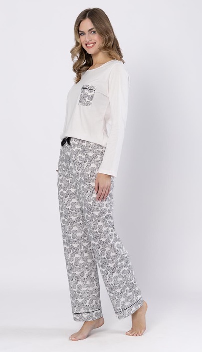 Piżama damska z długim rękawem i długimi spodniami. Dekolt bluzki jest okrągły, na piersi kieszonka z kontrastowego materiału. Wzorzyste spodnie ozdobione są satynową kokardką. Mają po bokach kieszenie. Piżama uszyta jest ze 100% bawełny. Piękna piżama damska w kolorze ecru-piaskowo czarnym.