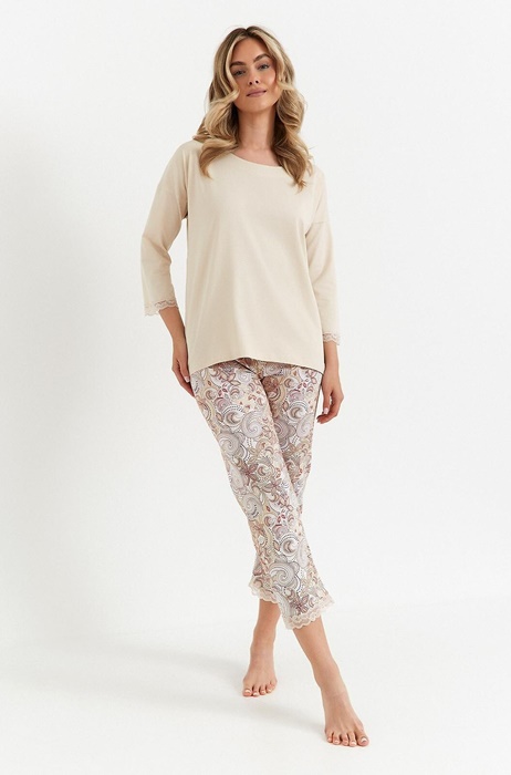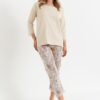 Piżama damska Cana z rękawami 3/4 długości oraz spodniami 7/8 długości. Rękawki i nogawki wykończone koronką. Bluzka od piżamy ma okrągły dekolt. Piżama damska bawełniana w kolorze waniliowym ze spodniami we wzorek.
