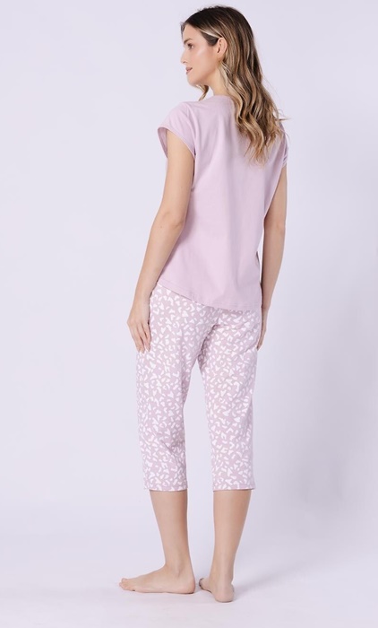 Piżama z krótkimi rękawami oraz spodniami 3/4 długości. Spodnie w cętki, bluzka jednolita. Dekolt bluzki okrągły. Piżama uszyta jest ze 100% bawełny.