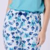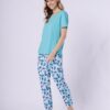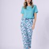 Piżama z krótkimi rękawami oraz spodniami 7/8 długości. Spodnie w kwiaty, bluzka turkusowa. Dekolt bluzki jest okrągły, w pasie zdobna kokardka. Piżama uszyta jest ze 100% bawełny.