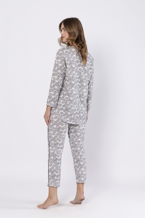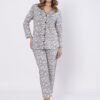 Piżama damska rozpinana z długimi rękawami i długimi spodniami. Dekolt bluzki w szpic, z kołnierzykiem, na biodrach, po bokach spodni kieszonki. Piżama uszyta jest ze 100% bawełny. Góra piżamy zapinana na guziki. Piękna piżama całkowicie rozpinana na guziki – idealny wybór jako piżama do szpitala, na operację, do porodu, czy też jako piżam dla młodej mamy do karmienia. Elegancka piżama damska rozpinana z efektownymi lamówkami.