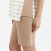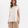 Piżama damska Cana z krótkim rękawem oraz krótkimi spodenkami. Bluzka od piżamy ma okrągły dekolt i krótkie rękawy, a po bokach kontrastowe wstawki. Bluzka od piżamy jest w kolorze ecru-beżowym z bluzką w paski. Krótka piżama damska z wysokiej jakości bawełny.