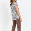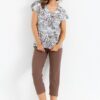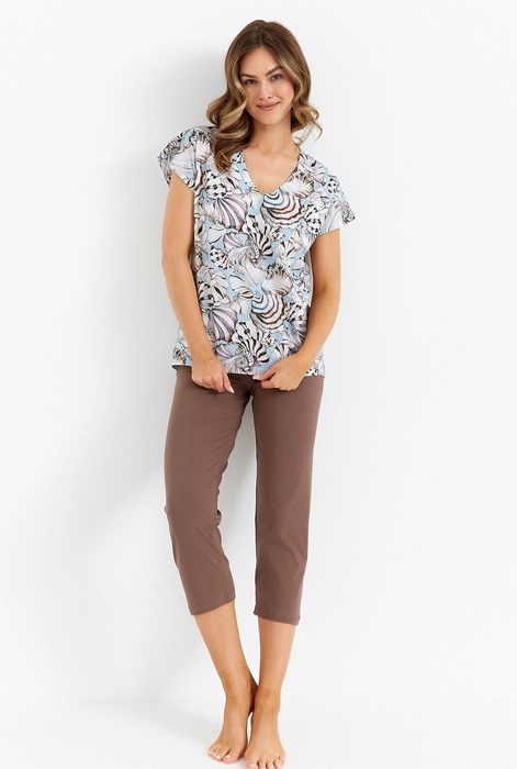 Piżama damska Cana z krótkimi rękawami oraz spodniami 3/4 długości. Bluzka od piżamy ma dekolt w szpic.. Bluzka jest w kolorze niebieskim w muszelki. Spodnie są w kolorze czekoladowego brązu.