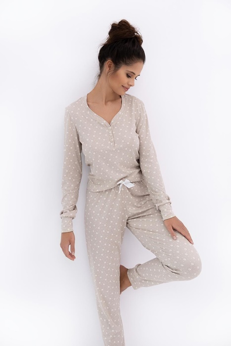 Piżama damska z długim rękawem i długimi spodniami w eleganckim bezowym kolorze we wzór w kwiatki. Bluzka od piżamy ma dekolt w łódkę z trzema guzikami. Piżama ciepła, z długimi rękawami.