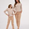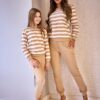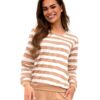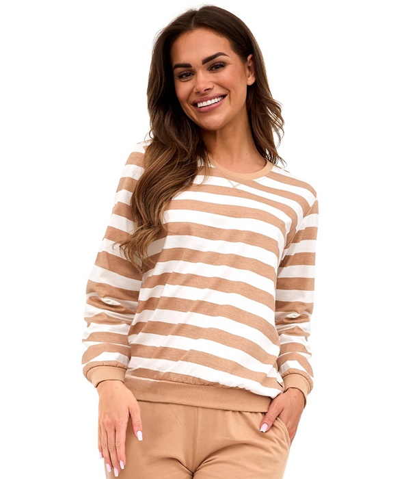 Piżama damska z długim rękawem i długimi spodniami. Góra od piżamy w paski, ma okrągły dekolt. Rękawy i nogawki mają ściągacze. Długie spodnie z kieszeniami.