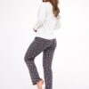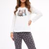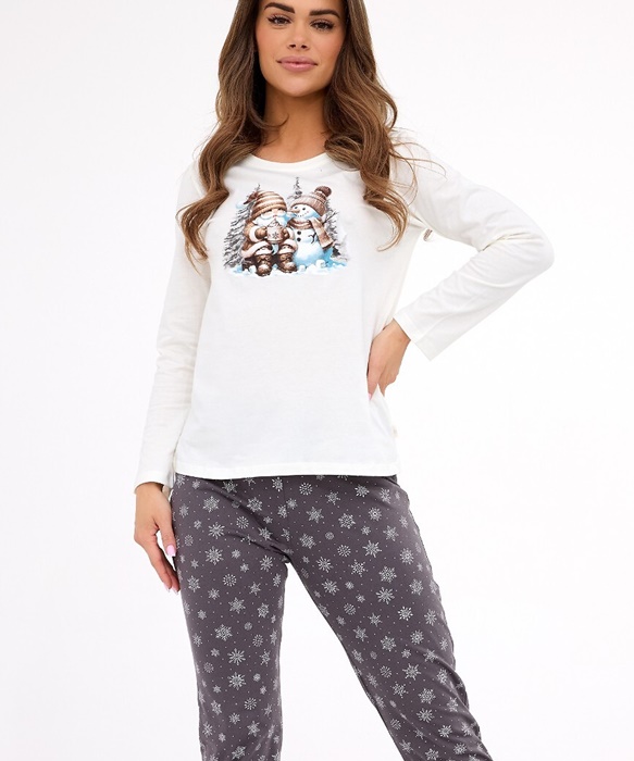 Piżama damska z długim rękawem i długimi spodniami. Góra od piżamy ma okrągły dekolt. Szaro ecru Świąteczna piżama damska.