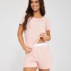 Piżama damska z krótkimi spodenkami oraz krótkim rękawem. Bluzka od piżamy ma dekolt okrągły. Piżama damska uszyta jest ze 100% bawełny. Idealna krótka piżama damska na wiosnę i lato.