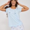 Piżama damska z krótkim rękawem i krótkimi spodenkami. Bluzka od piżamy ma okrągły dekolt. Piżama damska uszyta jest ze 100% bawełny. Piżama damska w pięknym pastelowym kolorze – biało błękitnym.