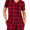 Piżama damska z krótkimi spodenkami i krótkim rękawem. Bluzka od piżamy ma dekolt w szpic, z kołnierzykiem i jest rozpinana na guziki. Góra od piżamy jest całkowicie rozpinana (na guziki). Piżama damska uszyta jest ze 100% bawełny. Piżama damska czerwona w kratę.