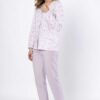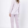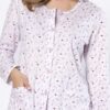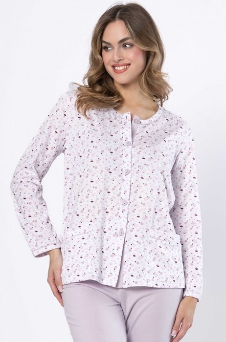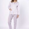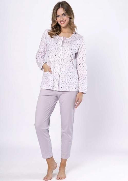 Piżama damska rozpinana z długimi rękawami i długimi spodniami. Dekolt bluzki jest okrągły i rozpinany. Piżama uszyta jest ze 100% bawełny. Piękna piżama całkowicie rozpinana na guziki – idealny wybór jako piżama do szpitala, na operację, do porodu, czy też jako piżam dla młodej mamy do karmienia. Elegancka piżama damska rozpinana z długim rękawem.