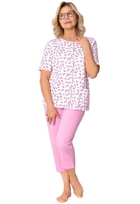 Wygodna bawełniana rozpinana piżama damska z krótkimi rękawami bluzki oraz długimi spodniami, długości 3/4. Bluzka od piżamy ma okrągły dekolt, z boków praktyczne kieszonki oraz jest zapinana na guziki. Spodenki od piżamy mają długość 3/4 (rybaczki). Piżama damska Martel uszyta jest z delikatnej, wysokiej jakości 100% bawełny.
