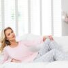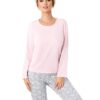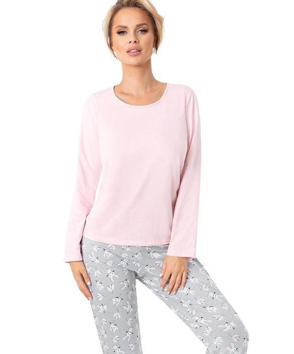 Piżama damska Donna z długimi rękawami oraz długimi spodniami. Bluzka od piżamy ma dekolt okrągły. Bluzka z długim rękawem, różowa. Długie spodnie szare w króliczki.