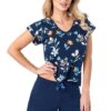 Piżama damska Donna z bluzką z krótkim rękawem i krótkimi spodenkami. Bluzka od piżamy ma dekolt w szpic. Spodnie to krótkie szorty z kokardką. Piękna krótka piżama damska w kolorze granatowym z bawełny.