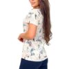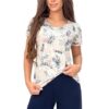 Piżama damska Donna z bluzką w kwiatki z krótkim rękawem i krótkimi spodenkami w kolorze granatowym. Bluzka od piżamy ma dekolt okrągły. Spodnie są krótkie, o dość swobodnym kroju. Piękna piżama damska w kolorze ecru-beż granat.