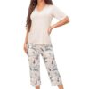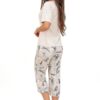 Piżama damska Donna z krótkim rękawem i spodenkami 3/4 – rybaczkami. Bluzka od piżamy ma dekolt w szpic z koronką. Spodnie długości 3/4 w roślinny wzór. Piękna piżama damska w kolorze ecru beżowym z wiskozy.