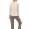 Piżama damska Donna z długimi rękawami oraz długimi spodniami w cętki. Bluzka od piżamy ma dekolt okrągły. Bluzka z długim rękawem. Piżama w kolorze eleganckiego beżu.