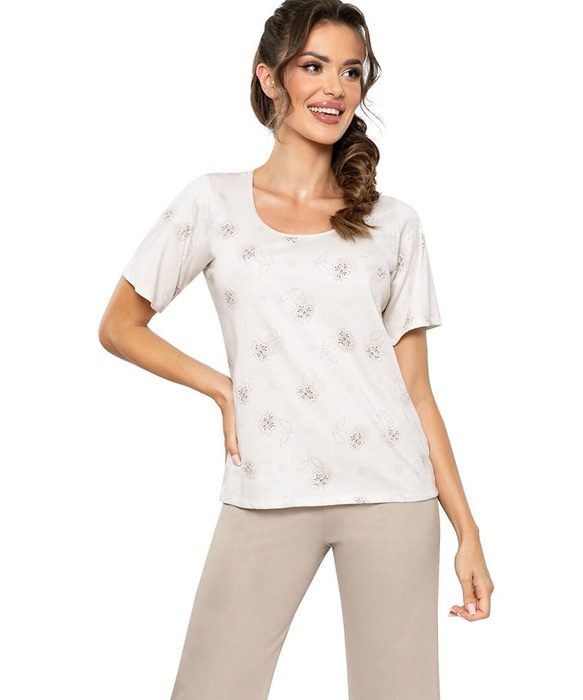Piżama damska Donna z krótkim rękawem i spodenkami 3/4 długości. Bluzka od piżamy ma okrągły dekolt. Spodnie długości 3/4 są beżowe. Piękna piżama damska w kremowo beżowym kolorze.