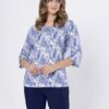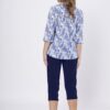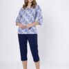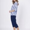 Piżama damska z rękawem 3/4 długości i spodniami 7/8 długości. Dekolt bluzki jest okrągły. Jednolite spodnie i wzorzysta bluzka. Piżama uszyta jest ze 100% bawełny. Piękna piżama damska w kolorze niebiesko granatowym.
