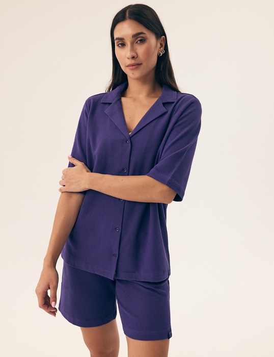 Piżama damska Henderson z rozpinaną bluzką z krótkim rękawem i krótkimi spodenkami. Piżama z wysokiej jakości bawełny o strukturze „waflowej”. Bluzka od piżamy ma dekolt w szpic z kołnierzykiem i jest całkowicie zapinana na guziki. Rękawy piżamy są krótkie i swobodne. Krótka piżama damska w ślicznym kolorze.