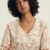 Piżama damska Henderson z rozpinaną bluzką z rękawem do łokci i krótkimi spodenkami. Piżama z wysokiej jakości wiskozy we wzór. Bluzka od piżamy ma dekolt w szpic z kołnierzykiem i jest całkowicie zapinana na guziki. Rękawy piżamy są krótkie i swobodne. Krótka piżama damska w klasycznym beżowo brzoskwiniowym kolorze.
