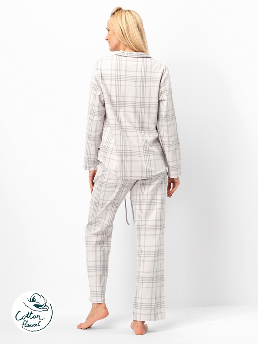 Flanelowa Piżama damska z długimi spodniami i długim rękawem. Koszulka od piżamy ma dekolt w serek z kołnierzykiem i jest zapinana na guziki. Piżama damska KEY uszyta jest z naturalnej, wysokiej jakości miękkiej flaneli bawełnianej (bawełna 100%). Elegancki wzór w kratkę piżamy rozpinanej na guziki, z długim rękawem.