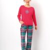 Piżama damska KEY z długim rękawem i długimi spodniami z flaneli. Bluzka od piżamy ma okrągły dekolt. Spodnie od piżamy są z ciepłej flaneli, mają proste nogawki i kieszenie po bokach. Piżama damska KEY uszyta jest z naturalnej, wysokiej jakości miękkiej bawełny. Spodnie od piżamy są z flaneli w kratkę.
