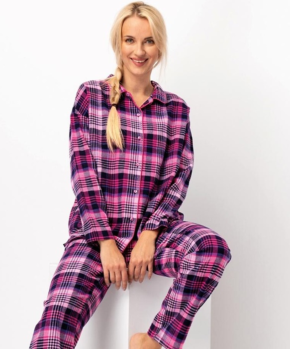 Flanelowa Piżama damska z długimi spodniami i długim rękawem. Koszulka od piżamy ma dekolt w serek z kołnierzykiem i jest zapinana na guziki. Piżama damska KEY uszyta jest z naturalnej, wysokiej jakości miękkiej flaneli bawełnianej (bawełna 100%). Elegancki wzór w kratkę piżamy rozpinanej na guziki, z długim rękawem.