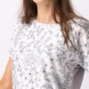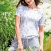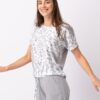 Piżama damska KEY z krótkim rękawem i krótkimi spodniami. Bluzka od piżamy ma okrągły dekolt. Spodnie od piżamy mają w pasie troczek do zawiązania kokardki. Piżama damska KEY uszyta jest z wysokiej jakości miękkiej wiskozy. Biało szara piżama damska z krótkimi spodenkami to idealny wybór na lato.