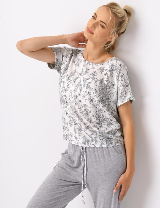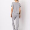 Piżama damska KEY z krótkim rękawem i długimi spodniami o swobodnym kroju. Bluzka od piżamy ma okrągły dekolt. Spodnie od piżamy mają luźny, swobodny krój. Piżama damska KEY uszyta jest z wysokiej jakości wiskozy.