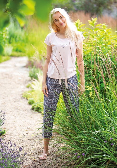 Piżama damska KEY z krótkim rękawem i spodniami 7/8 długości. Bluzka od piżamy ma okrągły dekolt. Spodnie od piżamy mają w pasie satynowy troczek do zawiązania kokardki. Piżama damska KEY uszyta jest z naturalnej, wysokiej jakości miękkiej bawełny.