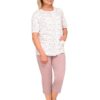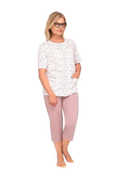 Wygodna i piękna rozpinana piżama damska Maria I ma krótkie rękawy bluzki oraz długie spodnie, długości 3/4. Bluzka od piżamy ma okrągły dekolt, z boków praktyczne kieszonki oraz jest zapinana na guziki. Spodenki od piżamy mają długość 3/4 (rybaczki). Piżama damska Martel Maria I uszyta jest z delikatnej, wysokiej jakości 100% bawełny.