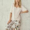 Piżama damska Taro z krótkim rękawkiem, oraz długimi spodniami – 7/8 długości. Bluzka od piżamy ma dekolt w łódkę. Spodnie w kwiaty.
