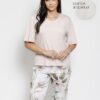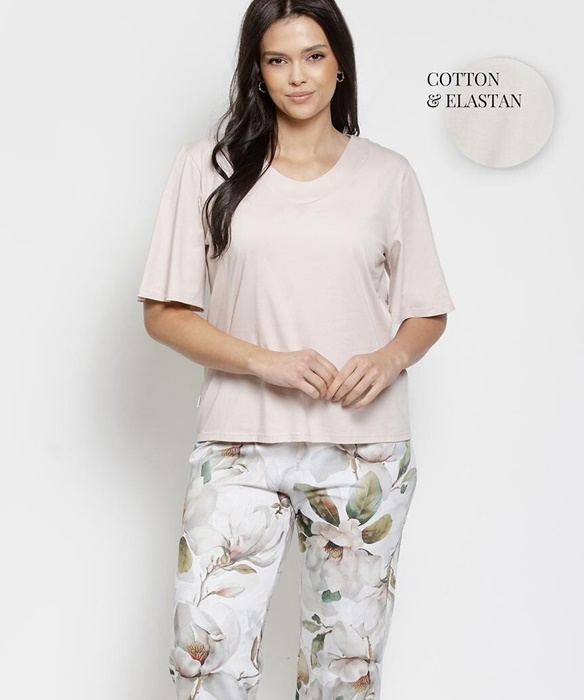Piżama damska Taro z krótkim rękawkiem, oraz długimi spodniami – 7/8 długości. Bluzka od piżamy ma dekolt w łódkę. Spodnie w kwiaty.