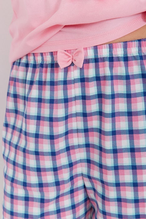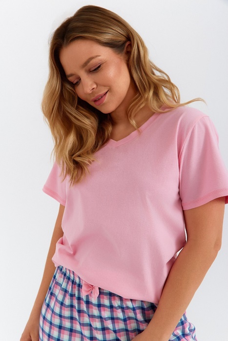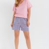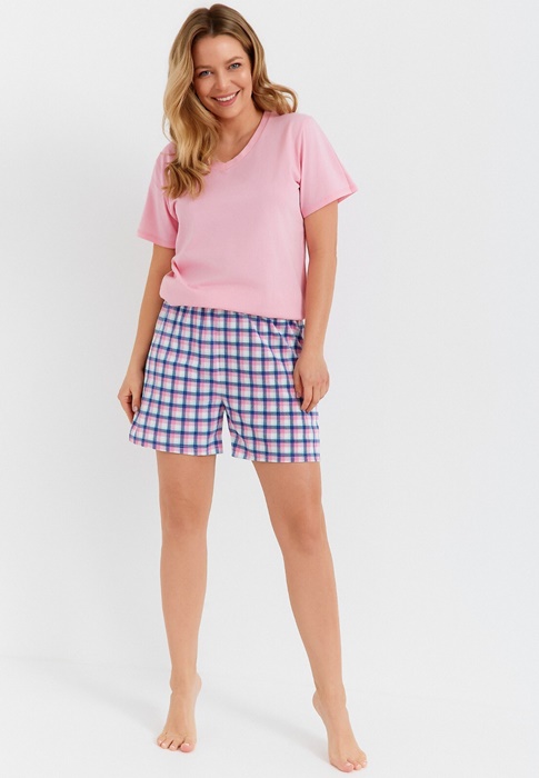 Piżama damska Taro z krótkim rękawkiem, oraz krótkimi spodenkami w kratkę. Bluzka od piżamy ma dekolt w szpic. Krótkie spodnie od piżamy mają w pasie zdobną kokardkę. Krótka piżama damska uszyta jest ze 100% bawełny.
