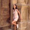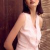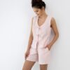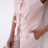 Piżama damska krótka Sensis – krótkie szorty i bluzka na szerokich ramiączkach. Piżama krótka w kolorze biało różowym w paski. Materiał to mieszanka lnu i bawełny. Idealna lniana krótka piżama damska na lato.