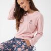 Piżama damska z długim rękawem i długimi spodniami. Koszulka od piżamy ma okrągły dekolt. Spodnie są wzorzyste w kwiaty. Piżama damska Luna uszyta jest z wysokiej jakości 100% bawełny.