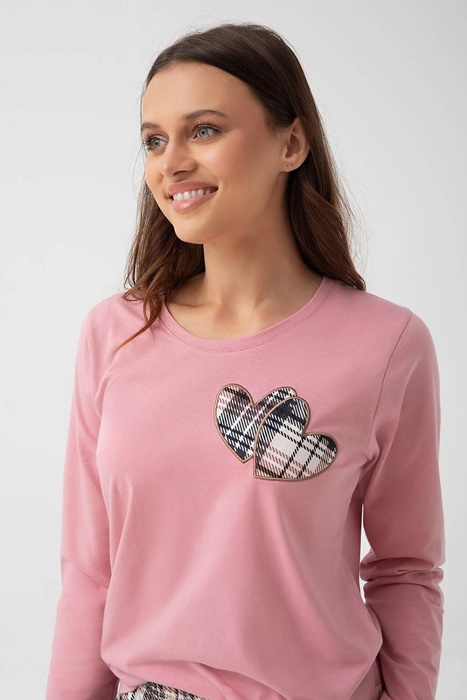 Piżama damska z długim rękawem i długimi spodniami. Koszulka od piżamy ma okrągły dekolt. Spodnie są w elegancką kratkę. Na piersi naszyte kraciaste serca. Piżama damska Luna uszyta jest z wysokiej jakości 100% bawełny.