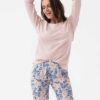 Piżama damska z rękawem długości 3/4 i spodniami 3/4 długości. Koszulka od piżamy ma okrągły dekolt. Spodnie są wzorzyste w kwiaty. Piżama damska Luna uszyta jest z wysokiej jakości 100% bawełny.