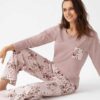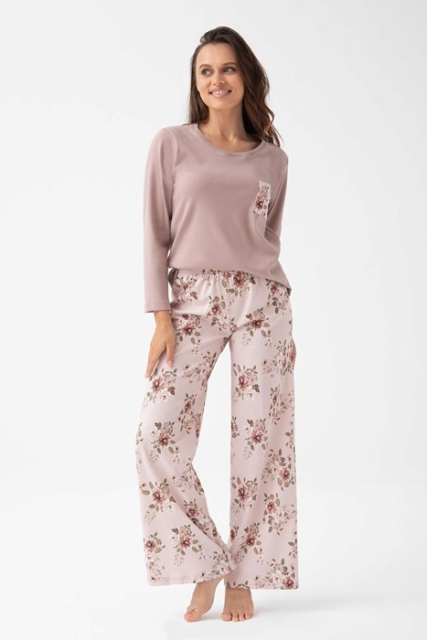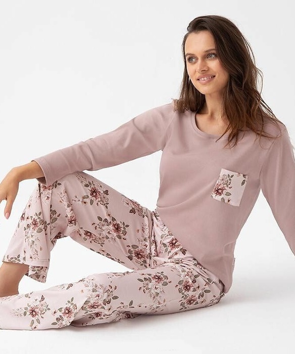 Piżama damska z długim rękawem i długimi spodniami w kwiaty. Koszulka od piżamy ma okrągły dekolt, na piersi kieszonkę w kwiaty i długie rękawy. Piżama damska Luna uszyta jest z wysokiej jakości 100% bawełny.