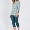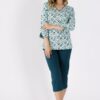 Piżama z rękawami 3/4 długości oraz długimi spodniami też 3/4 długości. Dekolt bluzki w serek, zaś rękawki mają zdobnie wycięte mankiety. Piżama uszyta jest ze 100% bawełny.