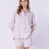 Piżama damska rozpinana z krótkimi rękawami do łokci i krótkimi spodniami. Dekolt bluzki jest w szpic, z kołnierzykiem i rozpinany. Piżama uszyta jest ze 100% bawełny. Piękna piżama całkowicie rozpinana na guziki – idealny wybór jako piżama do szpitala, na operację, do porodu, czy też jako piżam dla młodej mamy do karmienia. Elegancka piżama damska rozpinana z krótkim rękawem.
