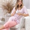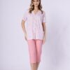 Piżama damska z krótkimi rękawami i spodniami długości 3/4. Dekolt bluzki w szpic – koszulka jest rozpinana. Piżama uszyta jest ze 100% bawełny. Piękna piżama z bluzką zapinaną na guziki – idealny wybór jako piżama do szpitala, na operację, do porodu, czy też jako piżam dla młodej mamy do karmienia. Elegancka piżama damska rozpinana od Leveza.
