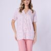 Piżama damska z krótkimi rękawami i spodniami długości 3/4. Dekolt bluzki w szpic – koszulka jest rozpinana. Piżama uszyta jest ze 100% bawełny. Piękna piżama z bluzką zapinaną na guziki – idealny wybór jako piżama do szpitala, na operację, do porodu, czy też jako piżam dla młodej mamy do karmienia. Elegancka piżama damska rozpinana od Leveza.
