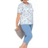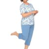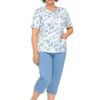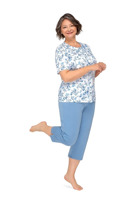 Wygodna rozpinana piżama damska Maria I ma krótkie rękawy bluzki oraz długie spodnie, długości 3/4. Bluzka od piżamy ma okrągły dekolt, z boków praktyczne kieszonki oraz jest zapinana na guziki. Spodenki od piżamy mają długość 3/4 (rybaczki). Piżama damska Martel Maria I uszyta jest z delikatnej, wysokiej jakości 100% bawełny.