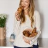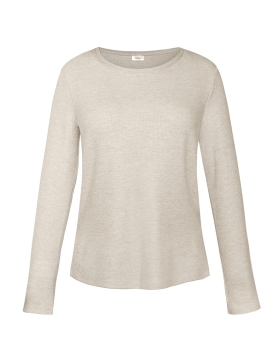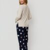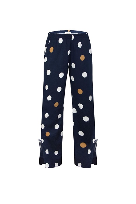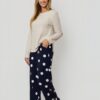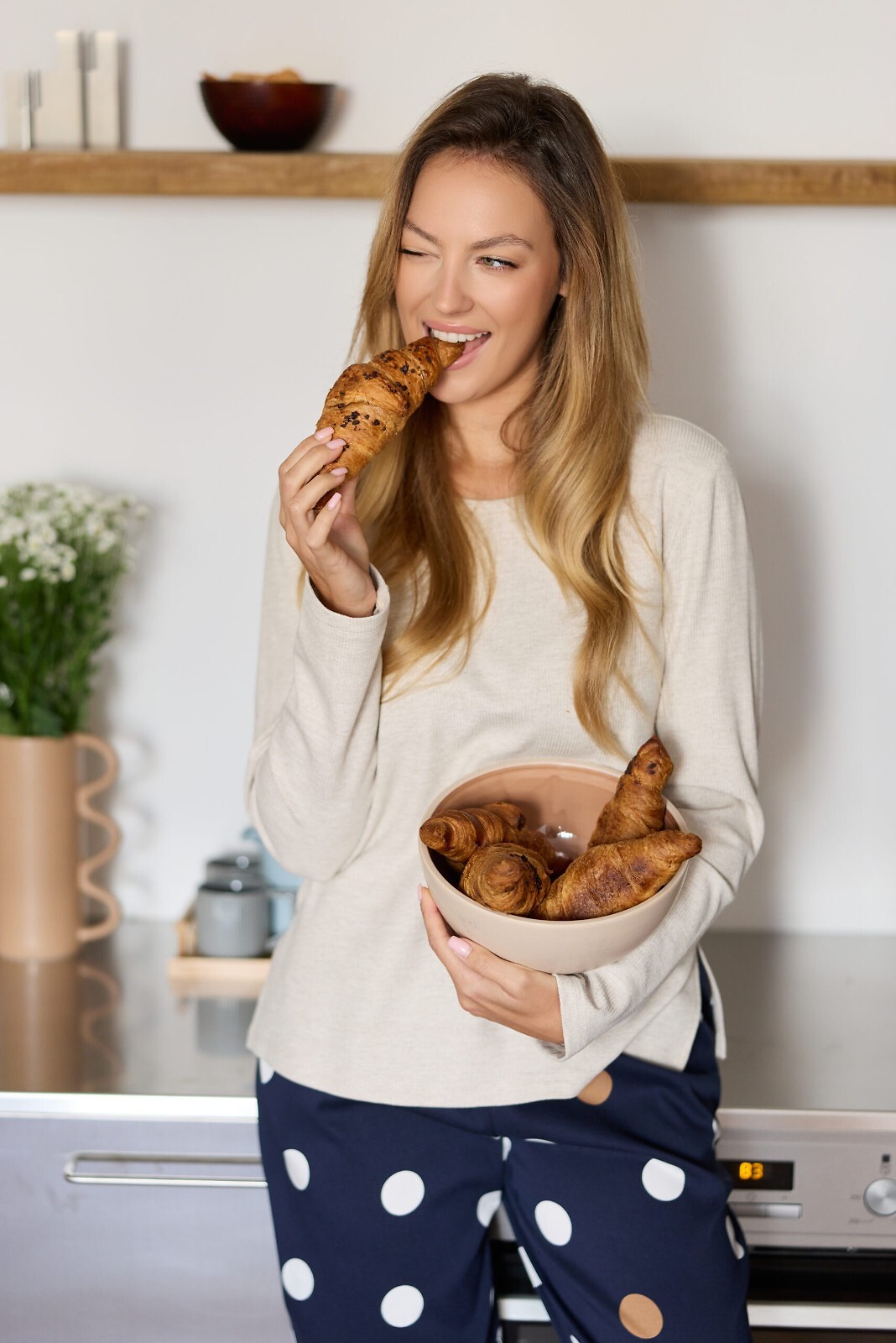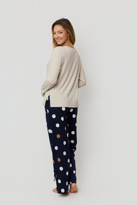Piżama damska z długim rękawem i długimi spodniami. Koszulka od piżamy ma okrągły dekolt. Spodnie są w białe i beżowe grochy. Piżama damska Mefemi uszyta jest z wysokiej jakości wiskozy.